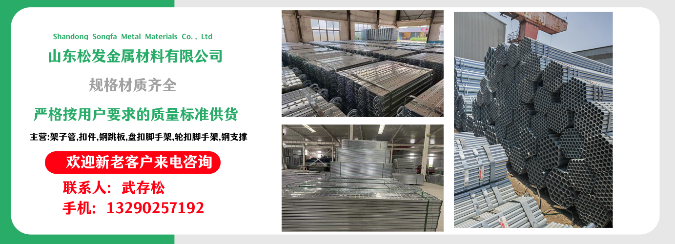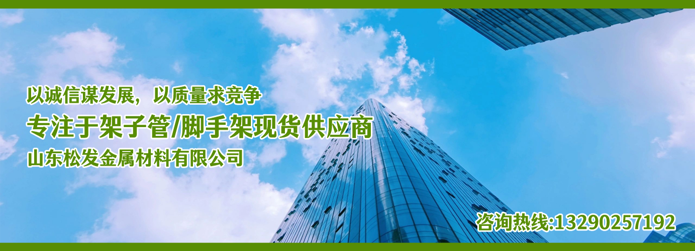山東松發(fā)金屬材料有限公司主營架子管,扣件,鋼跳板,盤扣腳手架,輪扣腳手架,鋼支撐生產(chǎn)廠家。本廠專業(yè)生產(chǎn)銷售。 建筑用架子管、 主要用于房建,橋梁,鐵路,公路,地鐵,水庫,隧道,支撐。 架子管,扣件,鋼跳板,盤扣腳手架,輪扣腳手架,鋼支撐的優(yōu)越性及應用“ ”產(chǎn)品因具有結構簡單合理、設計巧妙、使用方便、安全、快捷、易于運輸、儲存、維護簡單等特點。 公司一貫堅持“質(zhì)量,用戶至上,優(yōu)質(zhì)服務,信守合同”的宗旨,憑借著高質(zhì)量的產(chǎn)品,良好的信譽,優(yōu)質(zhì)的服務,產(chǎn)品暢銷全球。歡迎廣大客戶來電洽談,共同發(fā)展,共創(chuàng)輝煌! 山東松發(fā)金屬材料有限公司秉承誠信服務、恪守信譽的宗旨,在同等的質(zhì)量下,保證以最低的價格,最完善的服務,最高的信譽來答謝各界朋友的支持和厚愛,歡迎您的來電、咨詢,我們將竭誠為您服務!...
